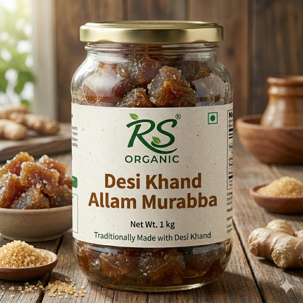 Allam Murabba is made completely from fresh ginger and pure jaggery that is made to keep its original properties. This product is a great alternative to commercially processed sweets as it does not contain any artificial colours, preservatives, or chemicals of any kind. The ginger has been processed through peeling, cutting, and boiling in jaggery syrup to keep its therapeutic nature. The method of production with organic certification ensures that each piece is a source of health, taste, and happiness to the consumer. The use of this traditional recipe is the symbol of the healing wisdom of the past, and it is available to the consumer as a natural, safe, and healthy delight for the family.